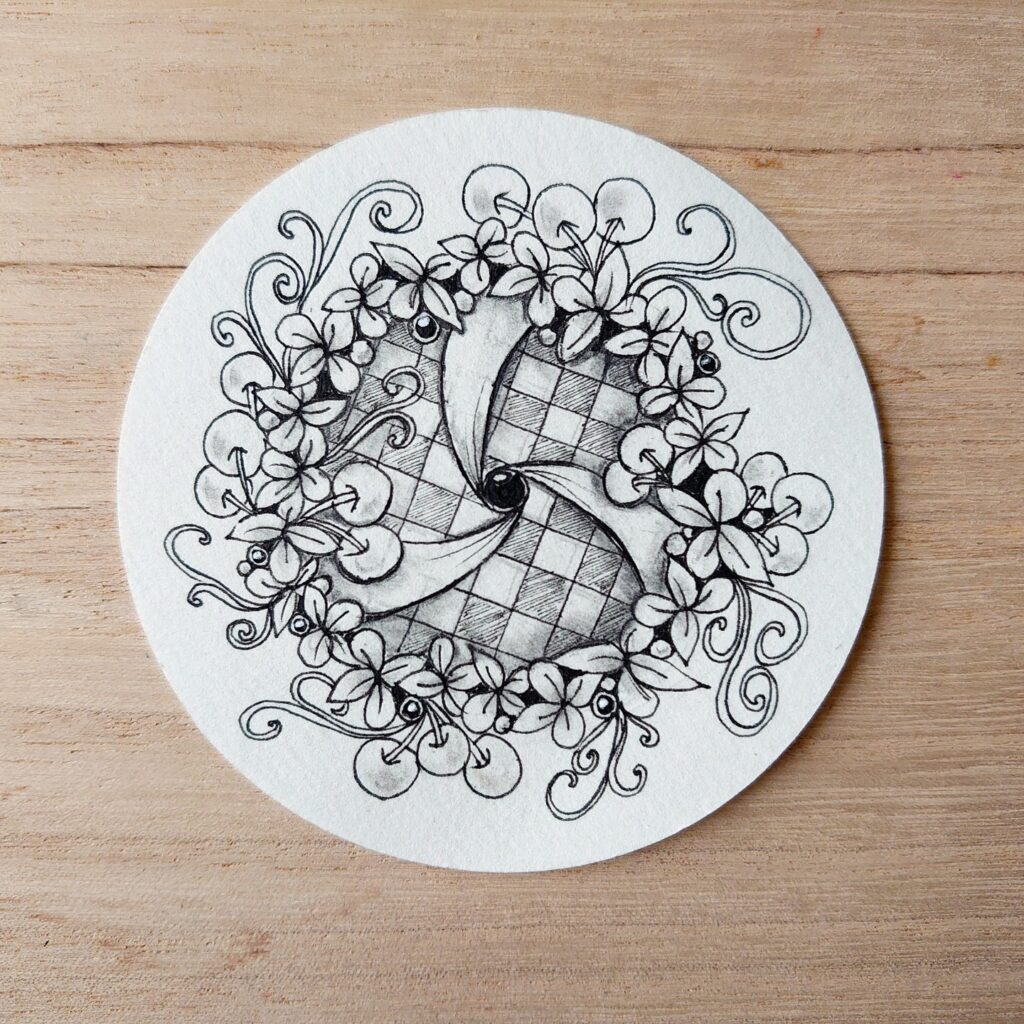 一つのタングルをただただ描きたい時があります。今回は"Bitona”。円形にぐるぐると描いた後で少しだけほかのタングルも加えてこんな感じ。