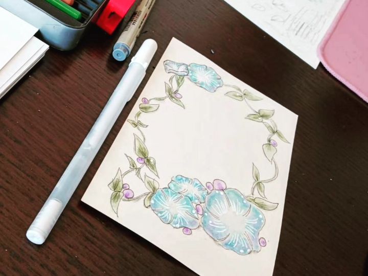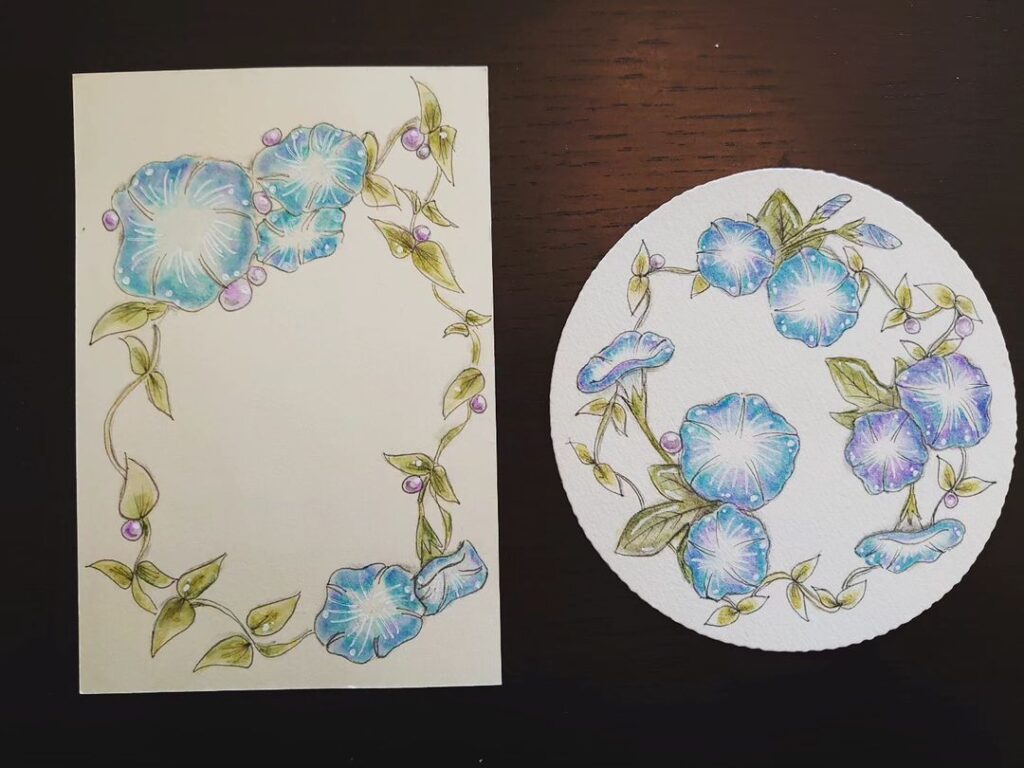 7月末のプライベートレッスンは、お友達への返礼にしたいとのことで、お手持ちのポストカードに。2度目のレッスンでこんな素敵に描かれました。cocoraというタングルはまるでツタのように描くことができます。自由にのびのびした感じがとても良いです。描かれた後はスキャンしてパソコンに取り込んで、さらに文字を入れて絵葉書に加工しました。楽しい時間をありがとうございました。