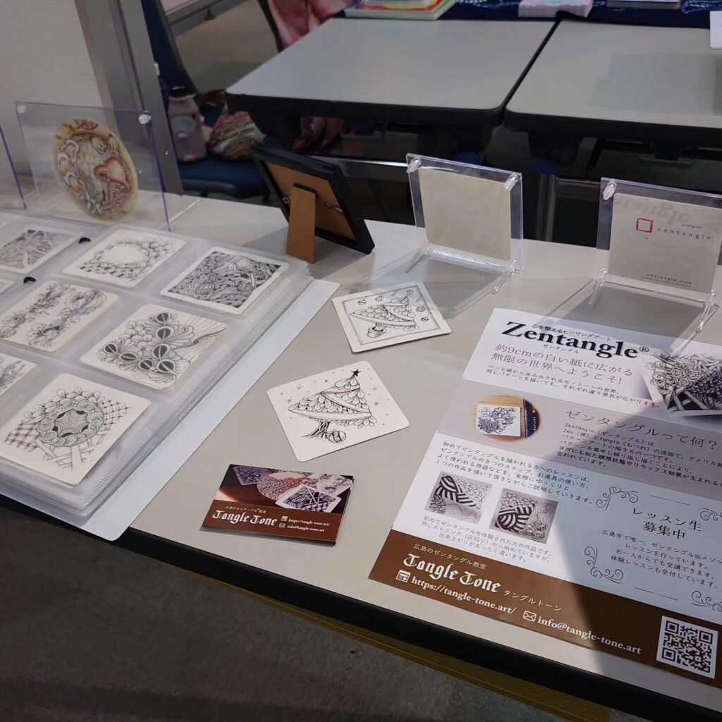 今まで描いた作品をブースの片隅にこそっと展示。それでもたくさんの人に見て頂いて、そもそも「ゼンタングル」って何って話をお伝えして、お時間が許す方には実際に描いて頂きました。ありがとうございました。