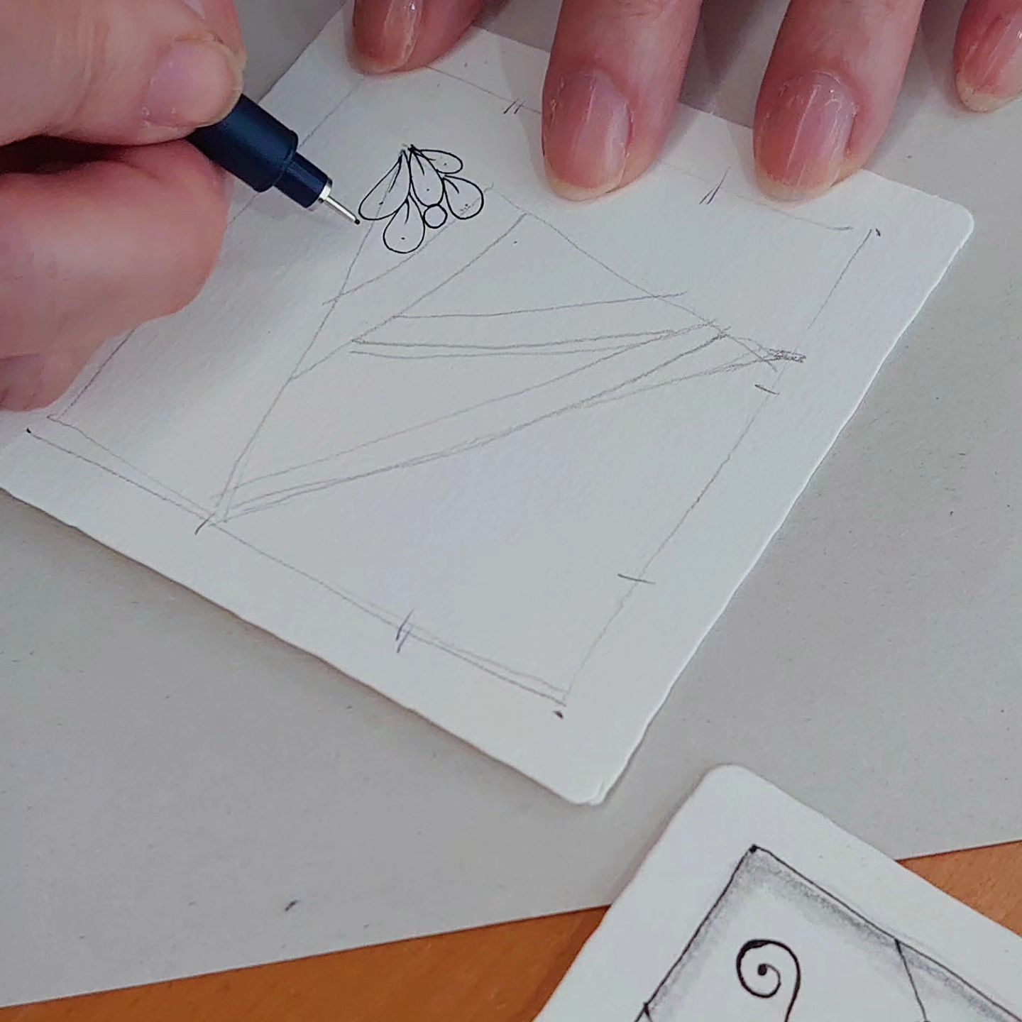 「ゼンタングル」という言葉すら知らない方に、少しでも覚えてもらうところからの開始です。ペン先を見て、「うわーこんなに細いの!?」「見えん見えん!」とワイワイガヤガヤ。